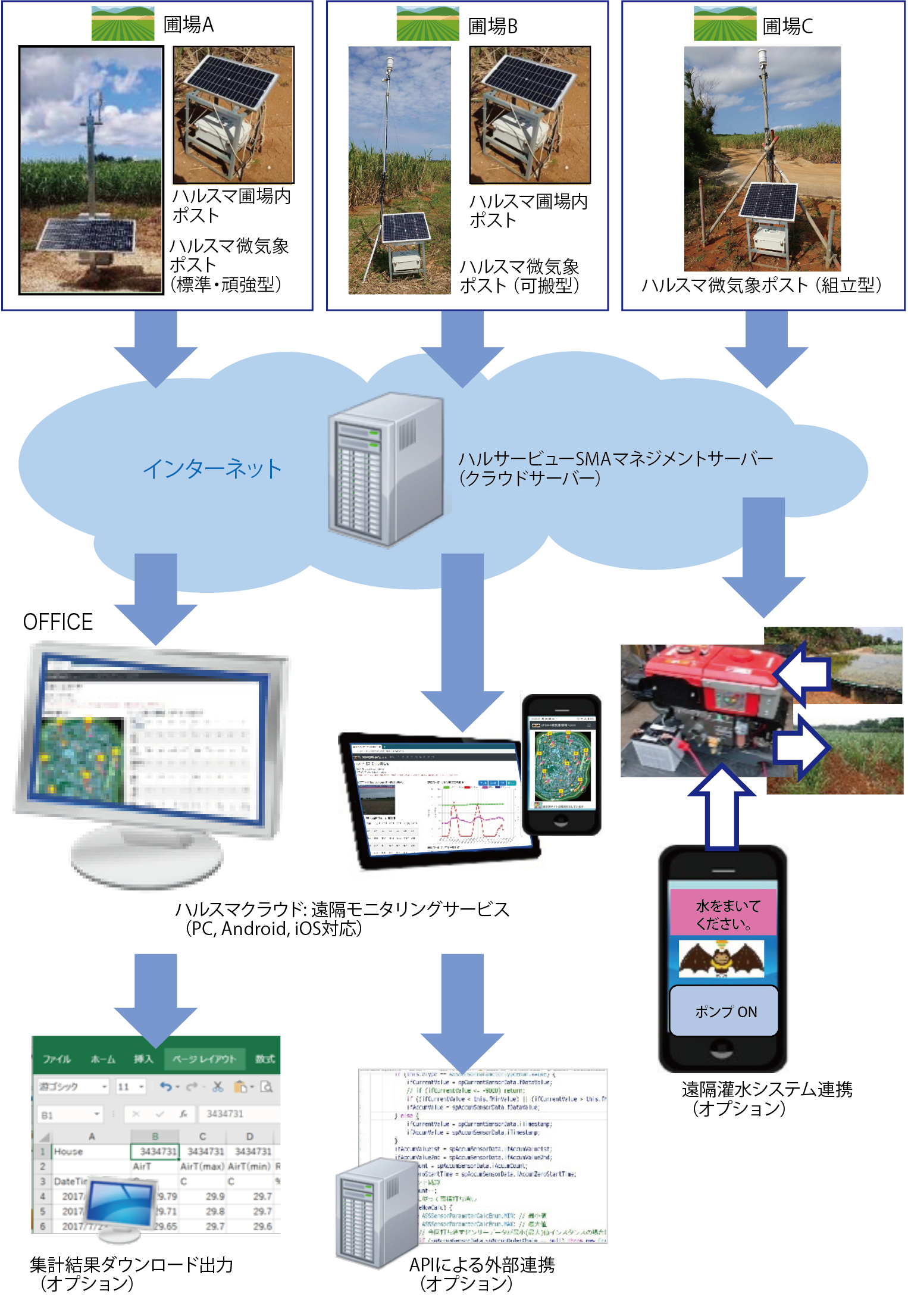 モニタリングは、クラウドサービス「ハルスマクラウド」によって、農家および農業法人等の圃場関係者や地域住民等へ、PCやスマートフォンを通じていつでもどこでも提供します。ハルスマクラウドは現状や集計確認だけではなく、データのダウンロード、計測結果を用いた遠隔灌水システムなど外部との連携可能であり、他に類を見ない農業IoTにおける先駆的なワンストップサービスを実現しました。