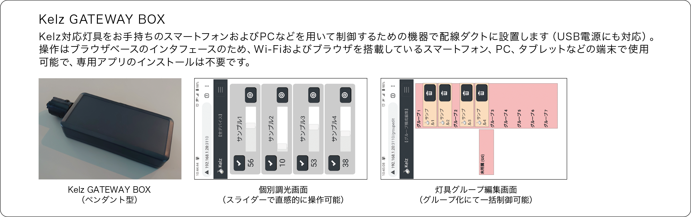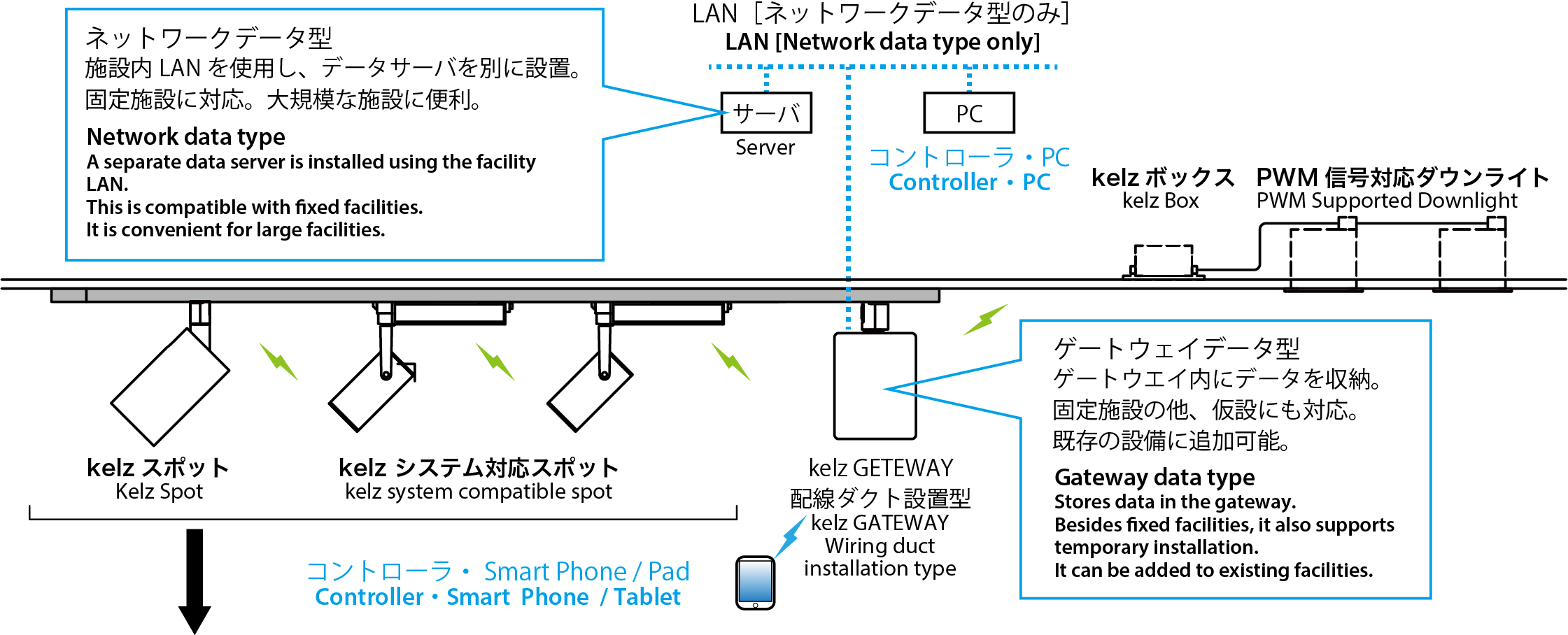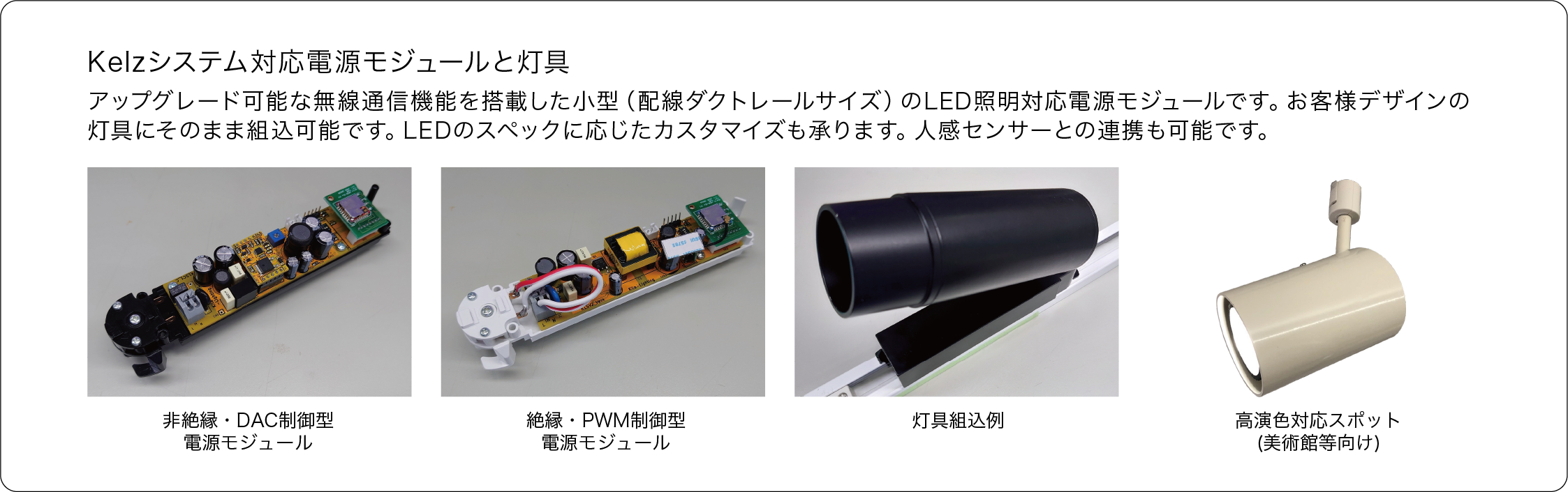 Kelzシステムは、店舗やホテルなどの商業空間や、美術館や博物館などの展示演出空間など様々な空間に対応した無線調光システムです。無線通信技術の進化に合わせてアップデート可能な構造を持っています。Kelzのために開発された小型の無線調光対応電源モジュールを使用することにより、既存の灯具の無線調光対応も容易です。
